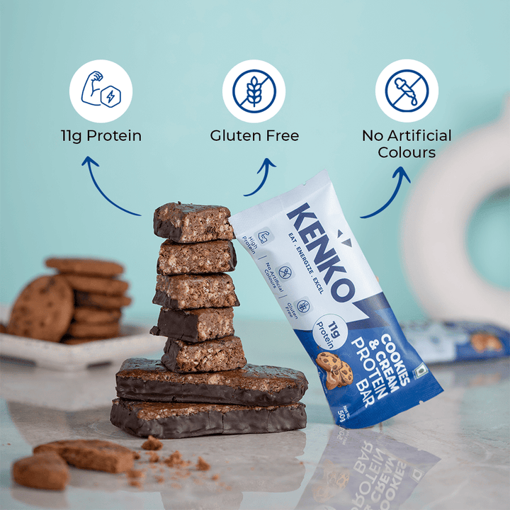 Enjoy the creamy-crunchy taste of Cookies & Cream in a guilt-free protein bar. The Kenko Cookies & Cream Protein Bar delivers 11g protein, gluten-free ingredients and no artificial colours for a balanced snack that feels indulgent but fuels your body.